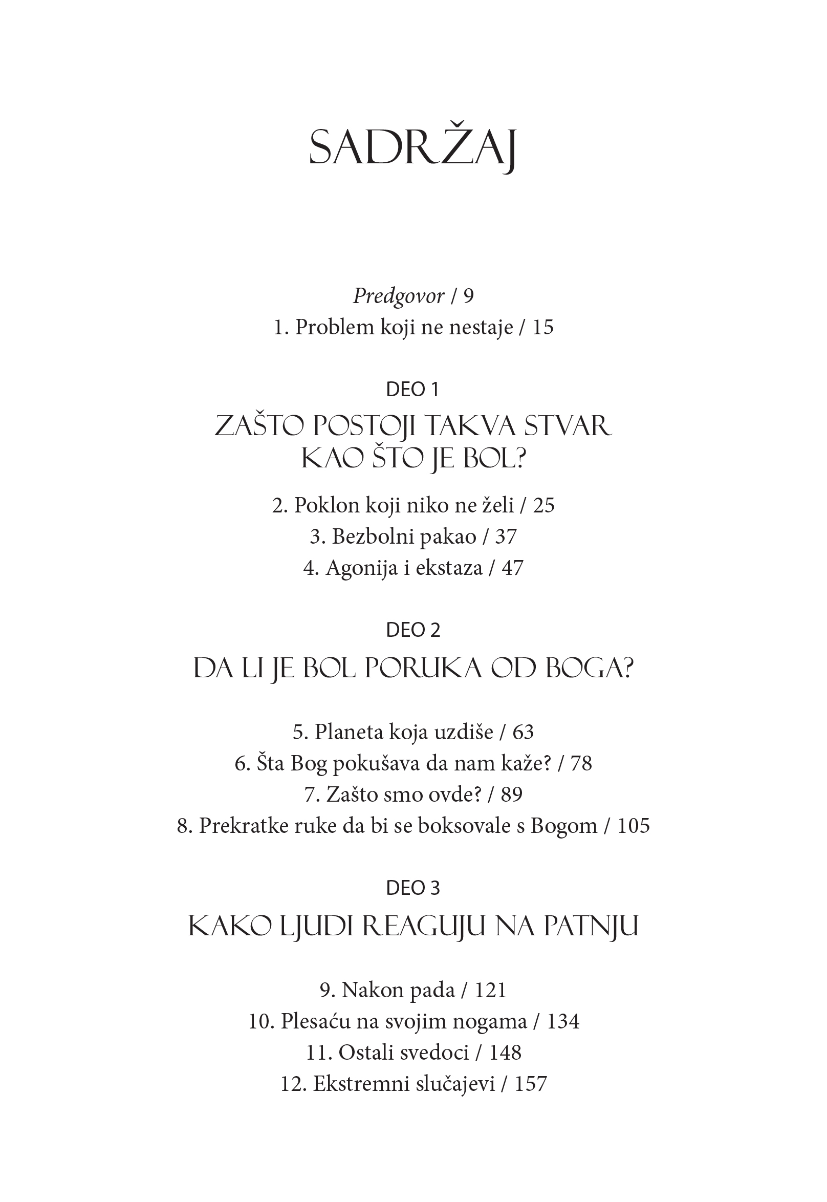 Sigurno ste već čuli ovo pitanje, možda ste ga i sami postavili. Bez obzira kako ono glasi, u njegovom korenu leži problem bola. Da li nam Bog šalje patnju? Da li On određuje ko će doživeti zlostavljanje u detinjstvu, da li upravlja događajima prilikom avionske nesreće, da li usmerava tornado ka naseljenom području? Ili je On jednostavno pokrenuo tok ovog sveta i sada sve posmatra izdaleka?