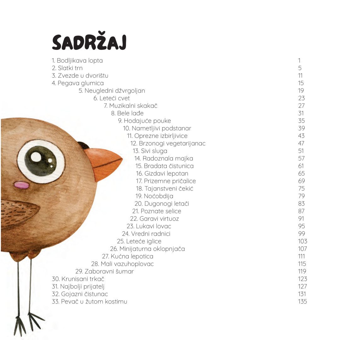 Brat i sestra, Teodor i Anja, leto provode na selu kod bake i deke. Na selu se susreću sa mnoštvom životinja o kojima saznaju puno toga. Pisana jednostavno i dopadljivo, uz dečije pesme i ilustracije, ova knjiga je veoma interesantna deci, proširuje saznanje o živom svetu i razvija interesovanje i ljubav prema prirodi.